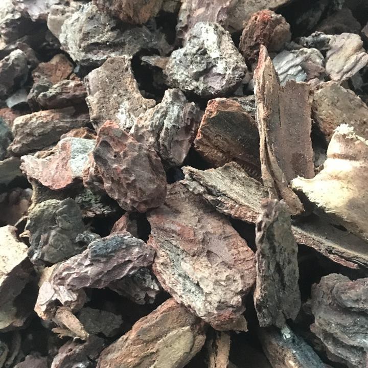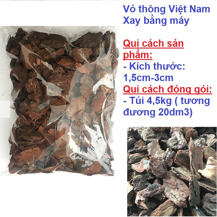 Vỏ thông được khai thác tại Việt Nam và được xay bằng máy nên các cạnh của miếng vỏ thông có độ tròn, không sắc cạnh như băm bằng tay. Thích hợp làm giá thể cho vào chậu để trồng các loại hoa lan.
