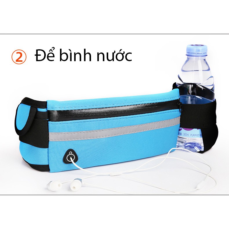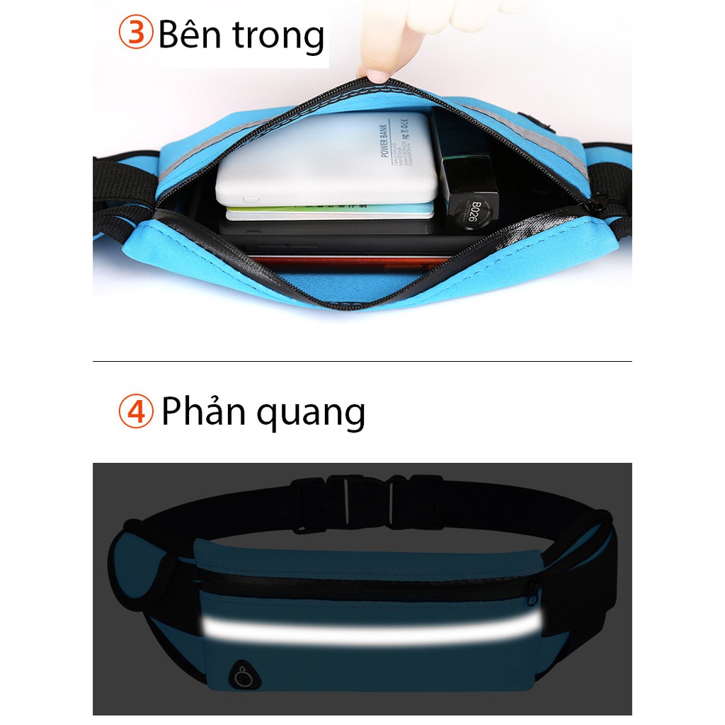 Túi bao tử để điện thoại tập GYMTúi sử dụng vải chống thấm nước, ngăn chính để điện thoại, để vừa điện thoại màn hính lớn 5.5 inch. Túi có lỗ đưa tai nghe ra ngoài. Mặt trước có thiết kế dây phản quang, thuận tiện cho người hoạt động thể thao trong điều kiện thiếu sáng. Bên tui có túi nhỏ để thẻ xe hoặc chìa khóa. bên còn lại có thể gài bình nước rất tiện khi tập chay hay đạp xe.