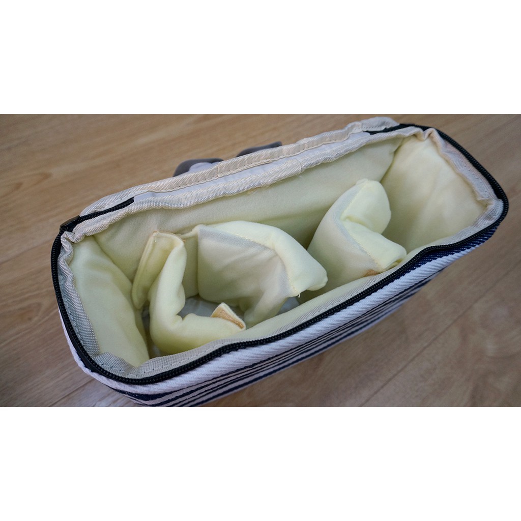 Túi sử dụng vải bố bên ngoài, bên trong túi có lót dày, êm giúp bảo vệ máy ảnh của bạn khỏi va đập. Túi có 3 tấm vách ngăn, có thể tháo dời và di chuyển tùy theo các sắp xếp máy khác nhau.