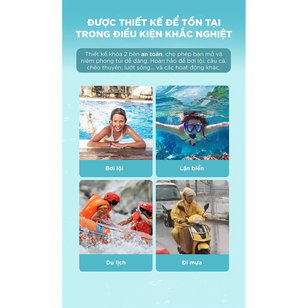 🎯 Thiết kế khóa 2 bên an toàn, cho phép bạn mở và niêm phong túi dễ dàng. Hoàn hảo để bơi lội, câu cá, chèo thuyền, lướt sóng ... và các hoat động khác.