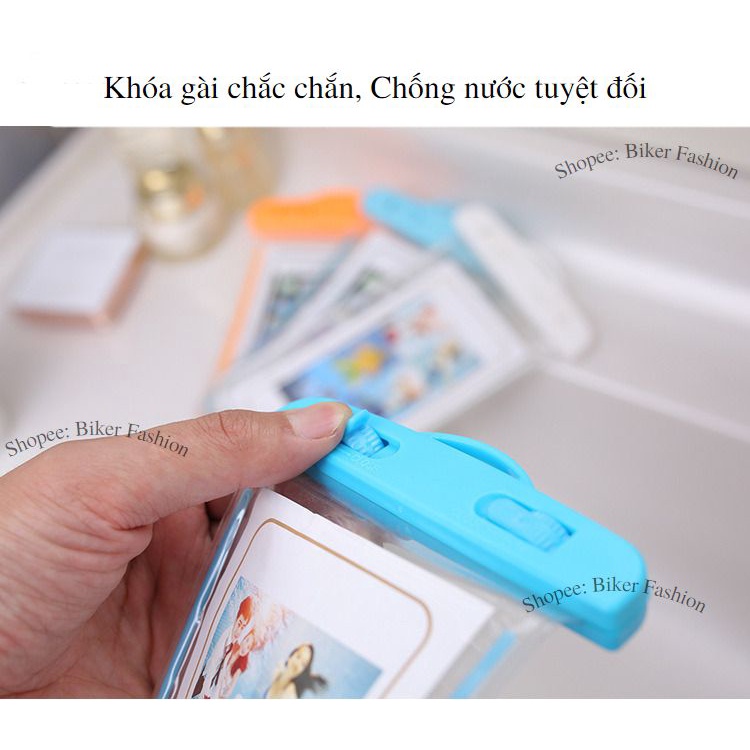 Túi đựng điện thoại chống nước có thiết kế khóa gài kín đáo, ngăn bụi bẩn, trầy xước do va chạm và đặc biệt chống thấm tốt, an toàn ngay cả trong môi trường nước.- Túi được làm từ chất liệu nhựa dẻo trong suốt, có tính năng cảm ứng nhiệt, giúp người dùng có thể sử dụng điện thoại để nghe, nhận cuộc gọi cũng như chụp ảnh dưới nước.