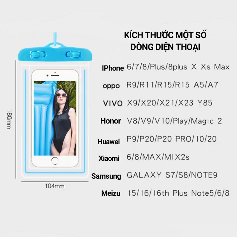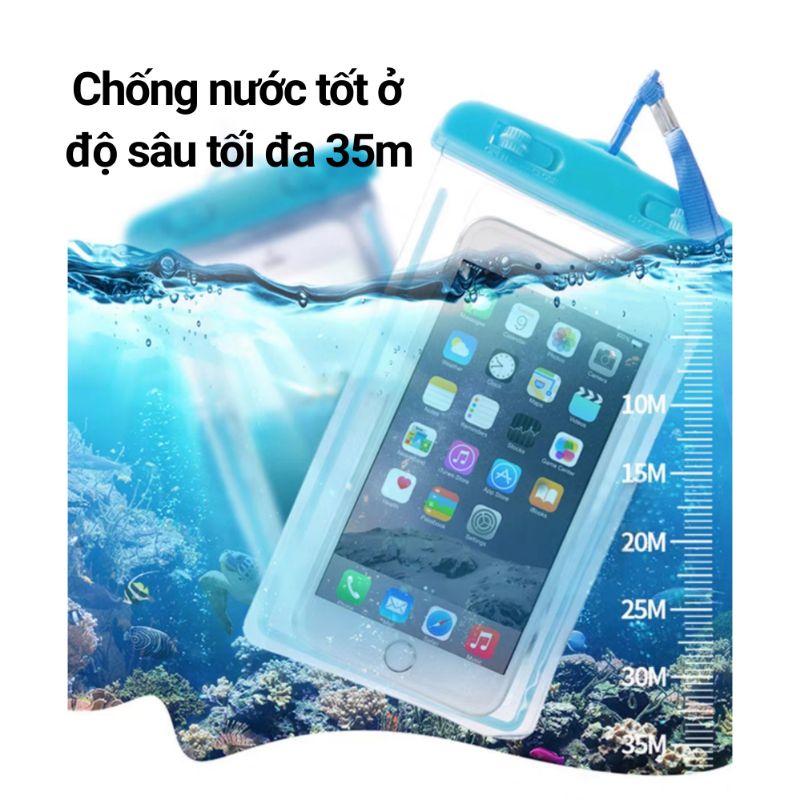 Túi đựng điện thoại chống nước có thiết kế khóa gài kín đáo, ngăn bụi bẩn, trầy xước do va chạm và đặc biệt chống thấm tốt, an toàn ngay cả trong môi trường nước.- Túi được làm từ chất liệu nhựa dẻo trong suốt, có tính năng cảm ứng nhiệt, giúp người dùng có thể sử dụng điện thoại để nghe, nhận cuộc gọi cũng như chụp ảnh dưới nước.
