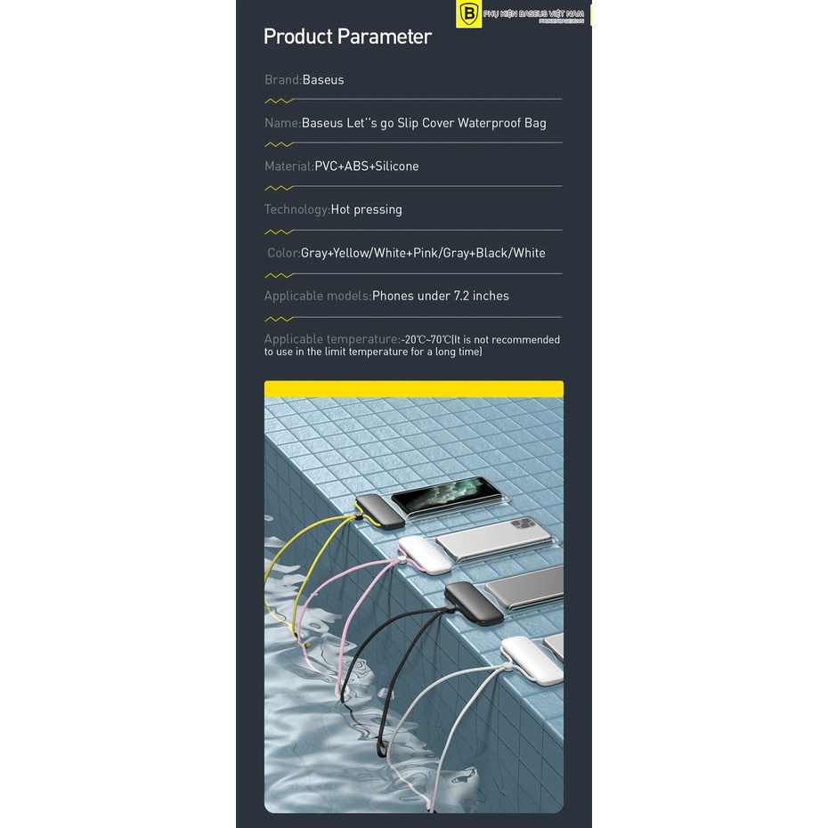 ⚡ Túi chống nước dùng cho điện thoại Baseus Let”s go Slip Cover Waterproof Bag là sản phẩm thuộc dòng Let’s go chuyên dùng cho thể thao và các hoạt động thể chất ngoài trời của Baseus .