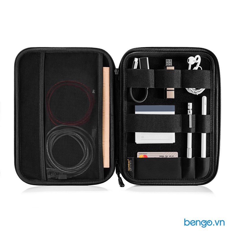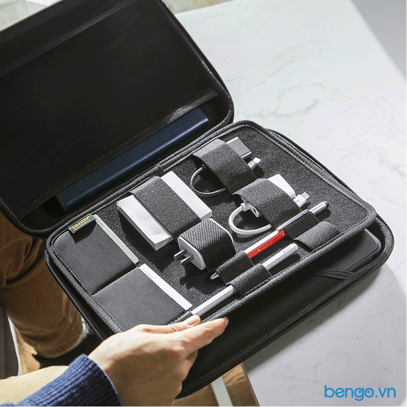 Bao gồm 1 ngăn chính để đựng iPad/Tablet, các ngăn phụ có các dây đai đàn hồi để đựng sổ tay, pin sạc dự phòng, cổng chuyển, thẻ tín dụng và hộ chiếu,... ngăn lưới có khoá kéo để chứa tai nghe, cáp sạc hay các vật dụng nhỏ hơn.