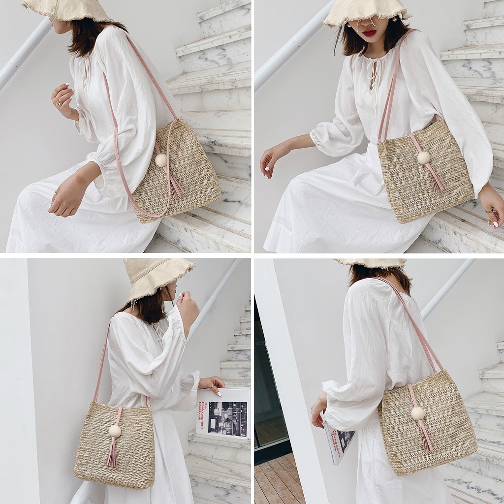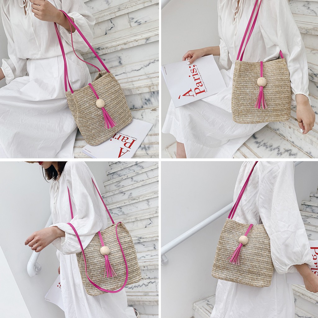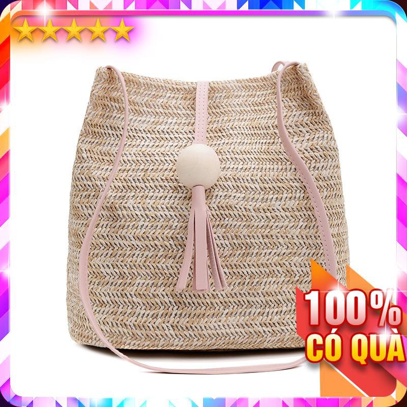 Nhà cửa & Đời sống > Dụng cụ chăm sóc nhà cửa > Chậu, xô & gáo nước || Túi Cói Xô Đi Biển Phối Tua Rua Hạt Gỗ Tròn P1353 -LoanTayCòn hàng