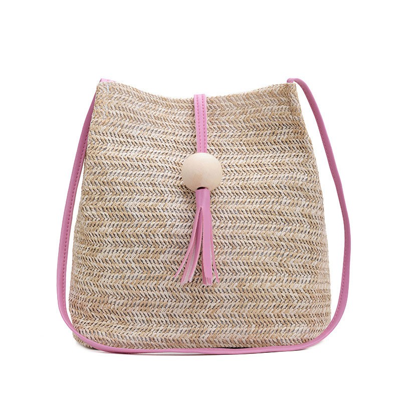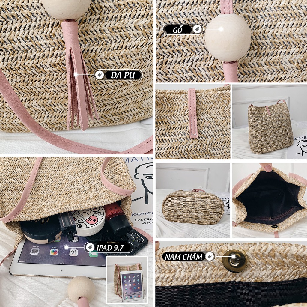 Túi Cói Xô Đi Biển Phối Tua Rua Hạt Gỗ Tròn P1353 -LoanTay