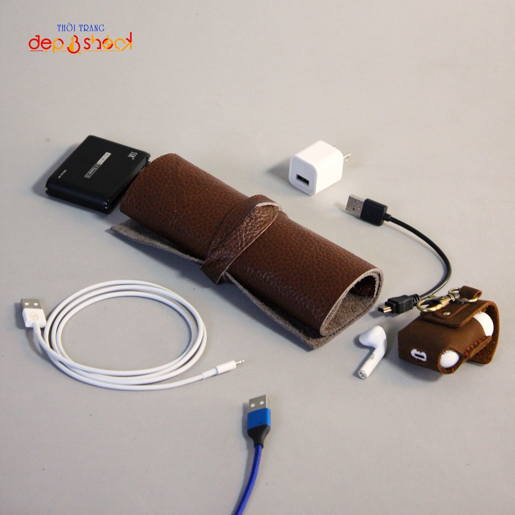 Túi da bò thật đựng phụ kiện, pin sạc dự phòng, điện thoại, cáp sạc usb, tai nghe