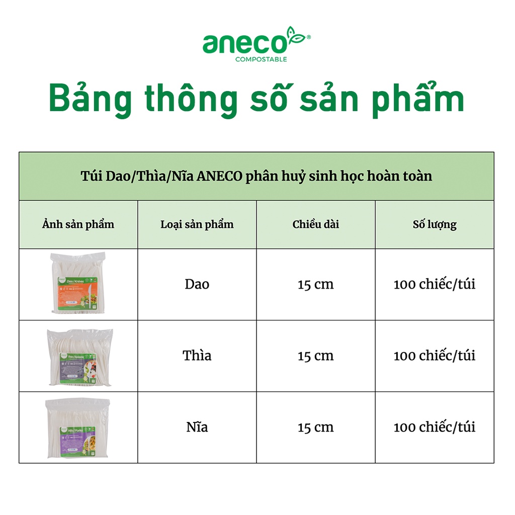 Giới thiệu Túi Dao Thìa Nĩa ANECO phân huỷ sinh học hoàn toàn - Không nhựa 100% - Bảo vệ môi trường (100 chiếc)