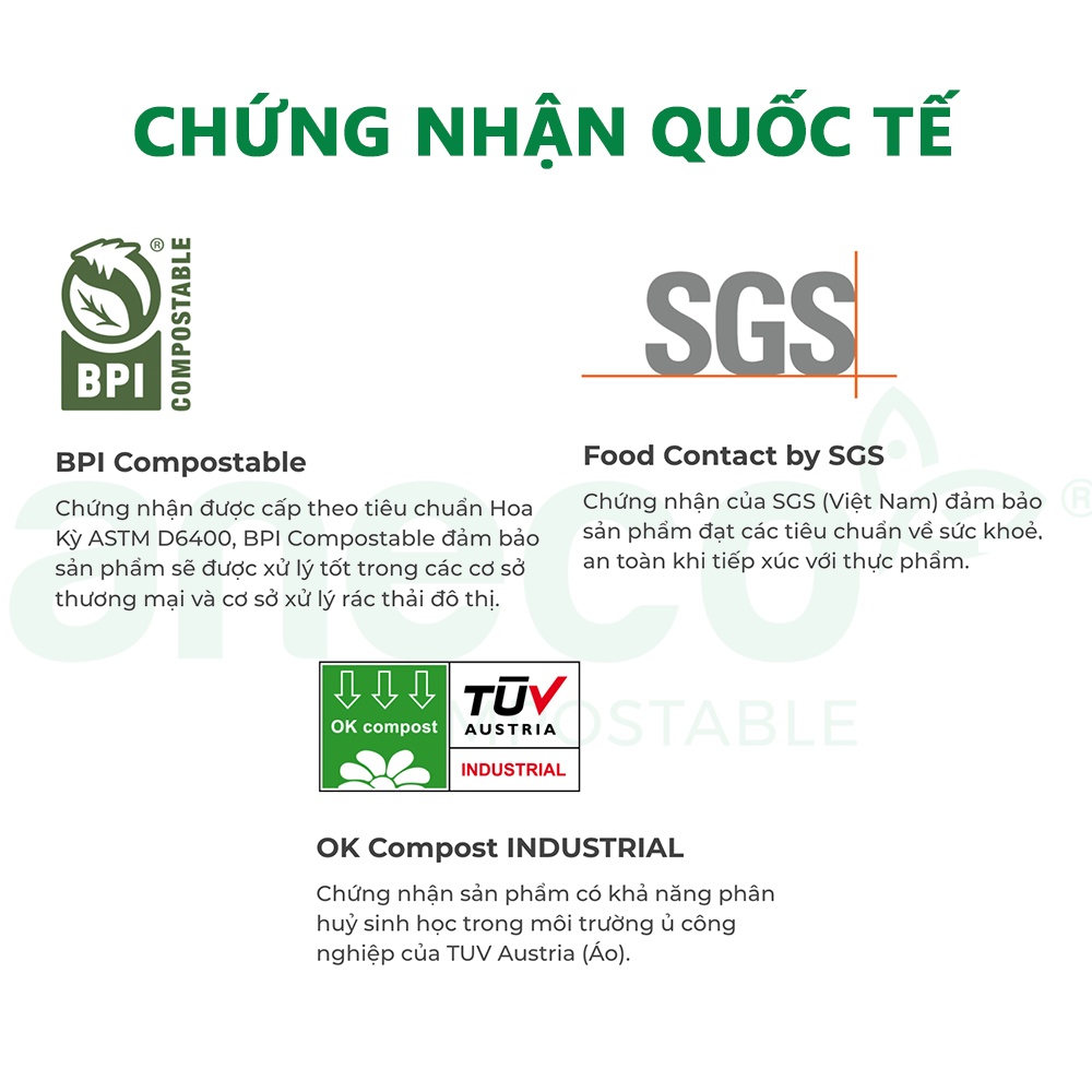 – BPI Compostable (chứng nhận quốc tế của Hoa Kỳ công nhận sản phẩm có thể phân huỷ sinh học trong môi trường công nghiệp)