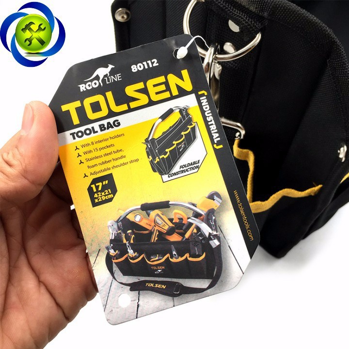 Túi đồ nghề Tolsen 80112 dài 420mm x rộng 160mm x cao 200mmTúi được thiết kế có thể xếp gọn lại khi không dùng, tay cầm bằng inox