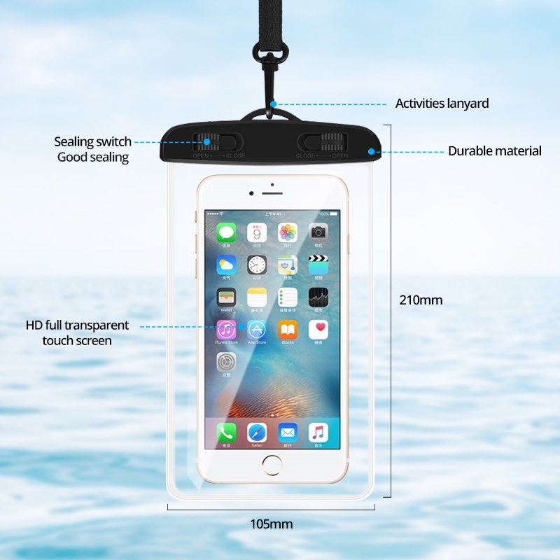 5. Chất liệu chất lượng cao: Túi được làm bằng chất liệu PC bền và PVC trong suốt. Chứng nhận IPX8 ở độ sâu 40 mét dưới nước.
