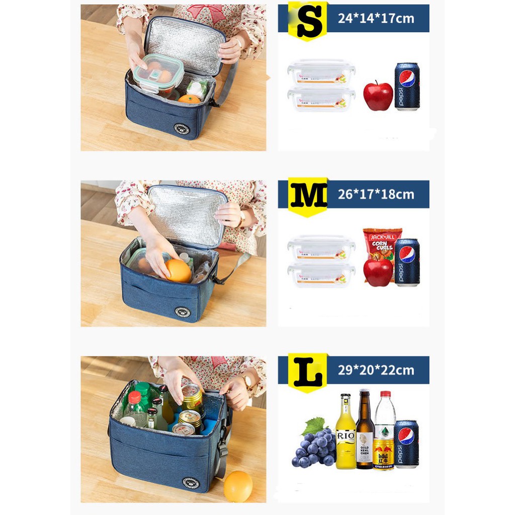 Cỡ L (DxRxC): 29x20x22cm : túi có thể đựng 2 hoặc 3 hộp cơm, 2 chai nước, hoa quả