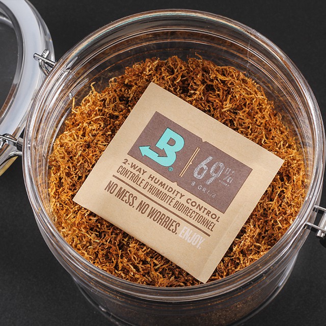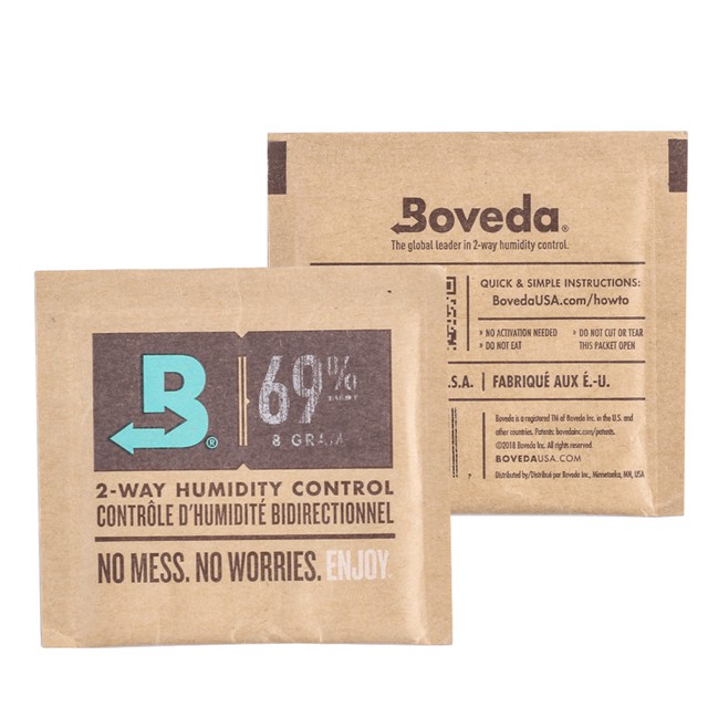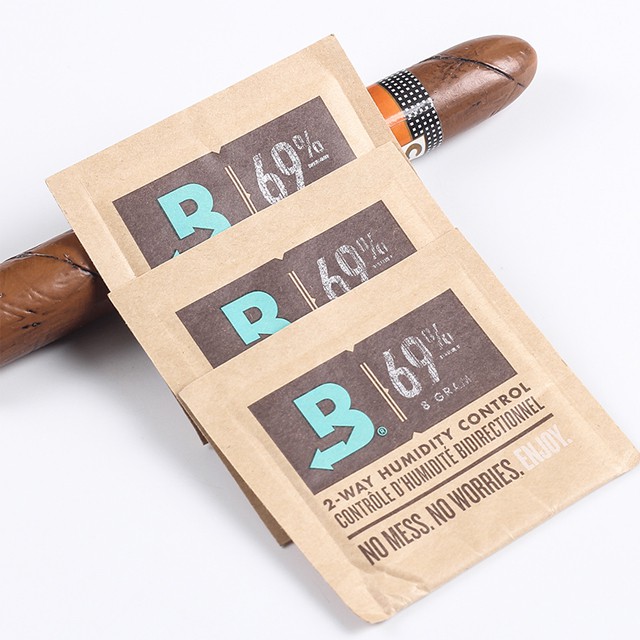 Túi dung dịch giữ ẩm xi ga Boveda có khả năng kiểm soát độ ẩm hai chiều bằng cách hấp thu và giải phóng độ ẩm.