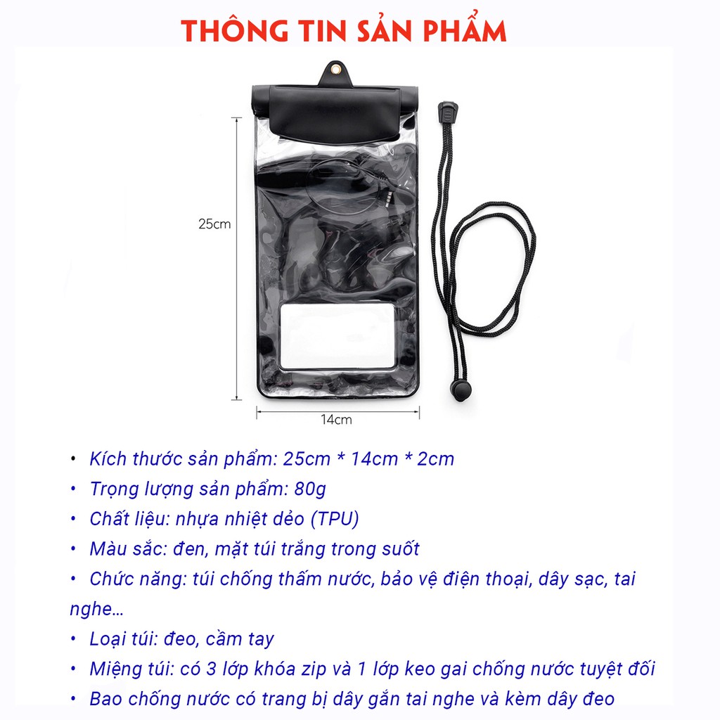 Túi đựng điện thoại chống nước D019 loại lớn bao chống nước điện thoại trong suốt có dây đeo và jack cắm dây tai ngheThông tin chi tiết túi đựng điện thoại chống nước D019: