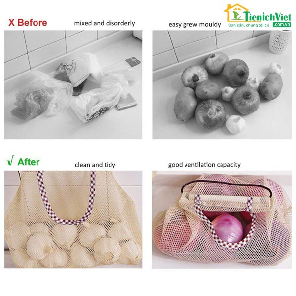 🍀Túi lưới đựng hành, tỏi được thiết kế đẹp mắt, dạng treo tiện dụng. Túi lưới không chỉ giúp bạn cất giữ được tỏi, hành, củ, hoa quả gọn gàng hơn mà còn gúp bạn bảo quản các loại nguyên liệu này tốt hơn, tránh bị ẩm mốc. Túi được thiết kế miệng rộng, miệng túi được viền may chắc chắn, tạo thuận lợi cho bạn khi sử dụng. Túi có kích thước khá rộng nên ngoài để hành tỏi, bạn còn có thể để nhiều vật dụng khác như mỹ phẩm, đồ dùng cá nhân cũng được.🍁Ưu điểm của bao lưới đựng hành tỏi trong nhà bếp: