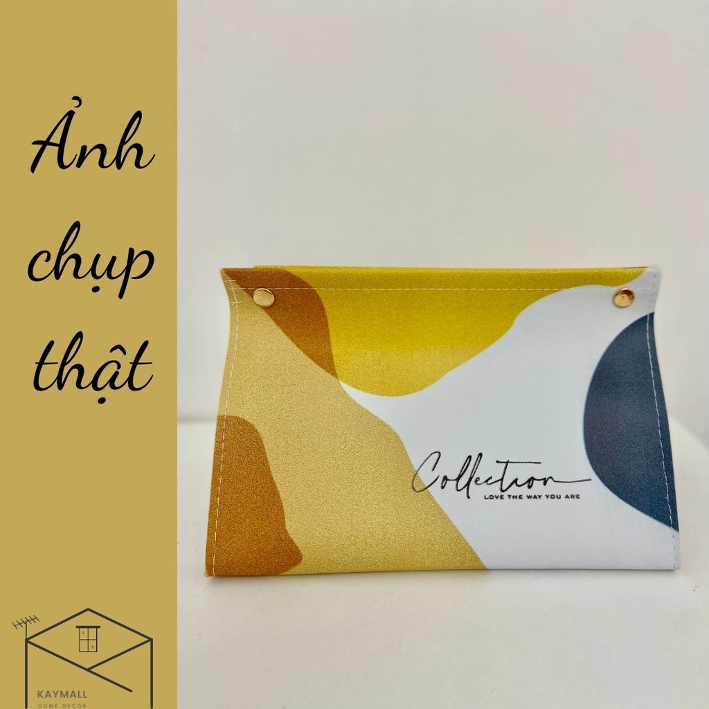- Túi đựng khăn giấy chất liệu da PU mềm mại, phối màu trẻ trung, thiết kế nút bấm 2 đầu thuận tiện trong việc thay đổi lõi khăn giấy. Đường may chắn chắn và khéo léo, vô cùng thích hợp trang trí nhà cửa/ bàn làm việc/ xe ô tô