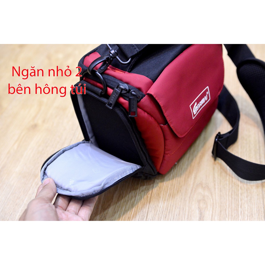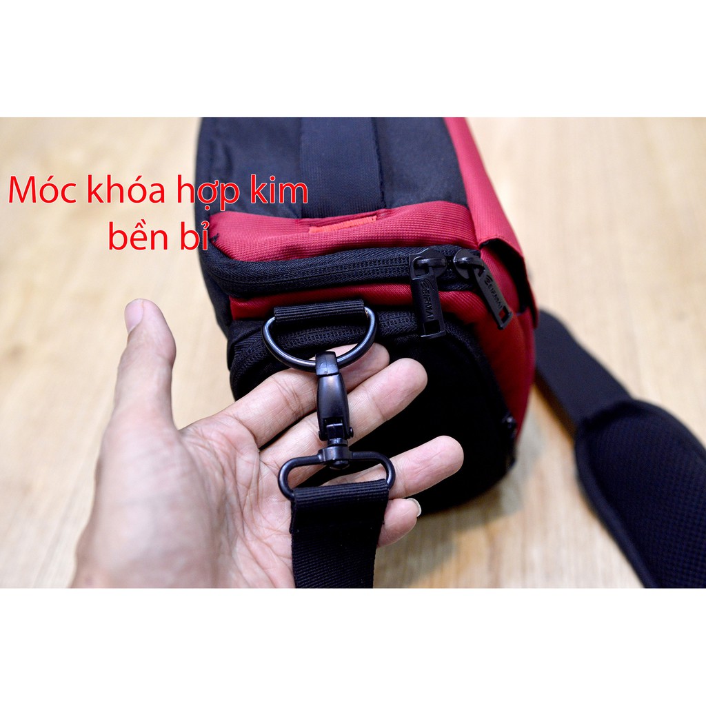Túi được làm từ vải kháng nước giúp bảo vệ máy ảnh bên trong được an toàn. Xung quanh túi có mút dày về êm, bên trong ngăn để máy ảnh có 2 miếng vách ngăn, có thể di chuyển hoặc tháo dời dễ dàng.