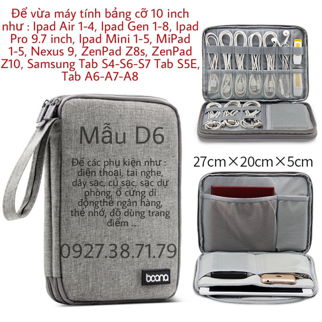 3. Túi BOONA D6 (Size L to) để vừa máy tính bảng cỡ 10 inch như : Ipad Air 1-4, Ipad Gen 1-8, Ipad Pro 9.7 inch, Ipad Mini 1-5, MiPad 1-5, Nexus 9, ZenPad Z8s, ZenPad Z10, Samsung Tab S4-S6-S7 Tab S5E, Tab A6-A7-A8 ....và các phụ kiện như : điện thoại, tai nghe, dây sạc, củ sạc, sạc dự phòng, ổ cứng di độngthẻ ngân hàng, thẻ nhớ, đồ dùng trang điểm ...