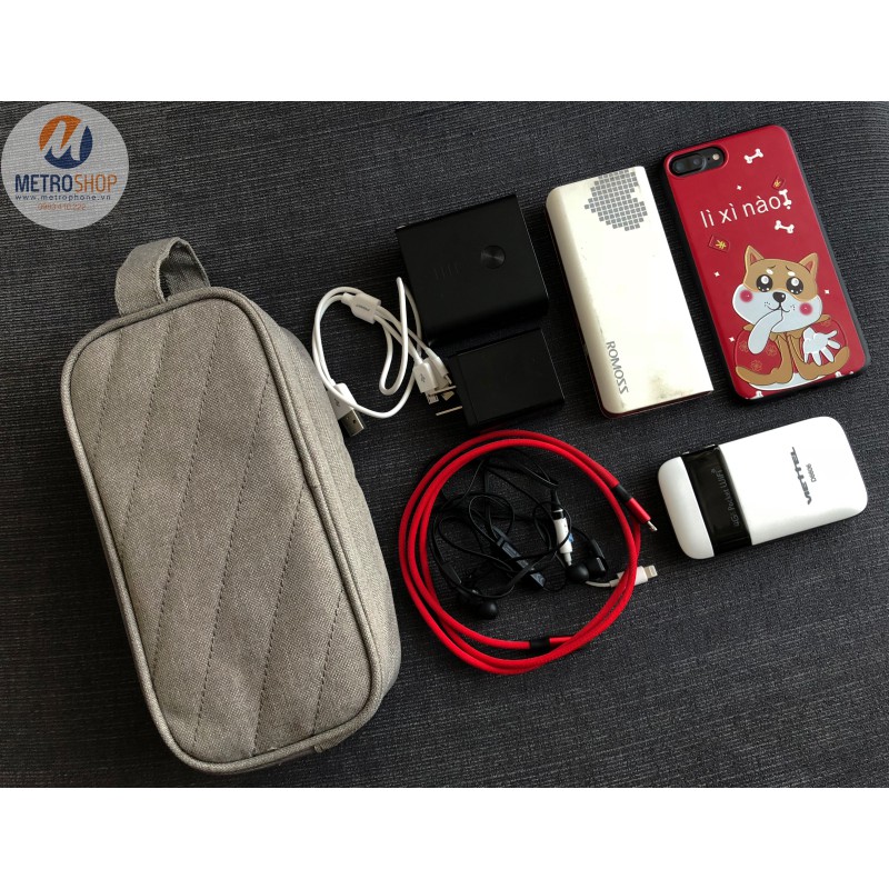Ngăn phía trước của túi có khả năng để được 2 chiếc điện thoại hoặc Pin dự phòng 10.000mAh. Phía trong túi phụ kiện có 2 ngăn nhỏ có thể để tai nghe, thẻ nhớ, vé xe, chìa khóa … Bên cạnh có thêm 5 ngăn để gài dây cáp sạc, cáp OTG hoặc USB.