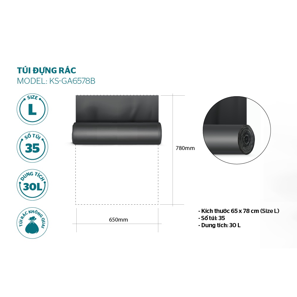 Sản phẩm được thiết kế không quai nhưng vẫn rất dễ thao tác khi sử dụng. Kích thước phù hợp để xử lý các loại rác thải sinh hoạt và dùng cho nhiều loại thùng rác thông dụng trên thị trường. Được thiết kế dưới dạng cuộn với các điểm ngắt dễ xé.