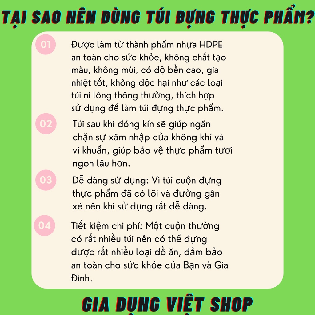 - Túi đựng thực phẩm có khả năng giữ nhiệt, ngăn chặn sự xâm nhập của không khí, bảo quản thực phẩm tươi ngon.