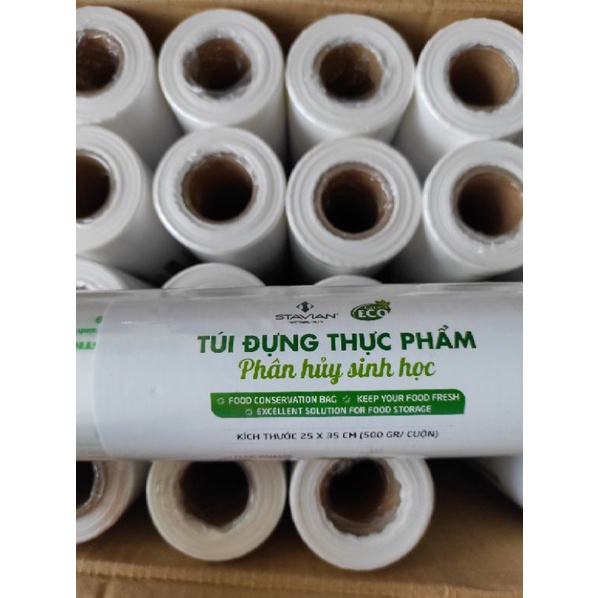 Túi đựng thực phẩm phân hủy sinh học Green eco 25cm x 35cm cuộn 500gThành phần: HDPE 80%, LDPE 15%, Chất tự phân hủy....