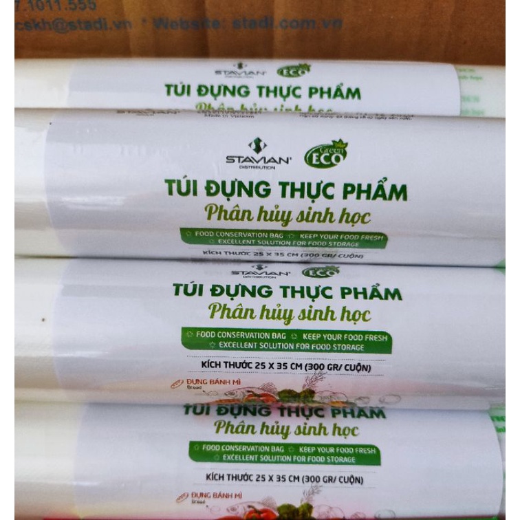 Túi đựng thực phẩm phân hủy sinh học Green eco 25cm x 35cm cuộn 300gThành phần: HDPE 80%, LDPE 15%, Chất tự phân hủy....