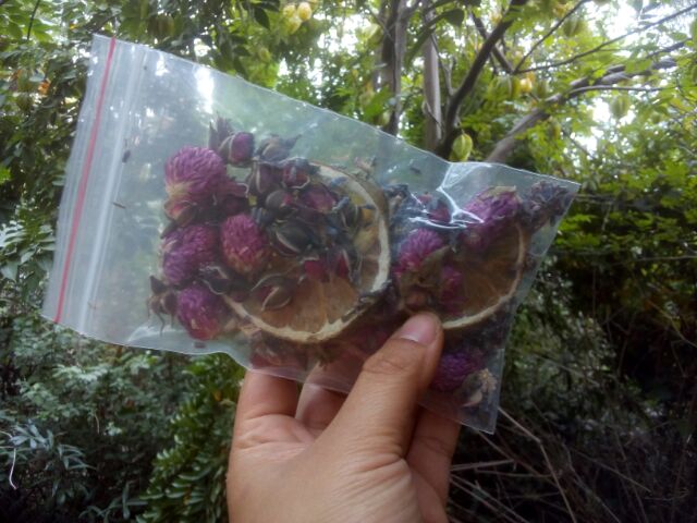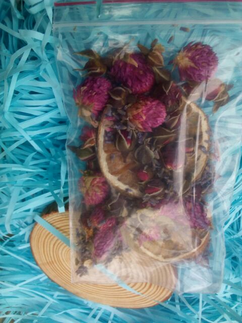 Túi hoa khô như hình, gồm miếng cam khô, hoa cúc bách nhật, nụ hồng, hoa oải hương. Dùng cho vào trang trí nến, làm sáp thơm, đồ trang trí....Giá: 15k/túi
