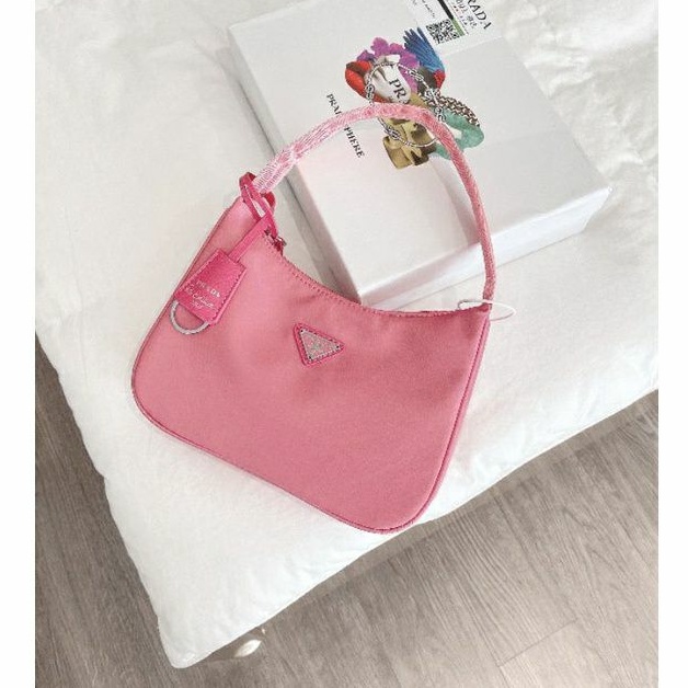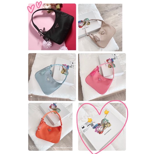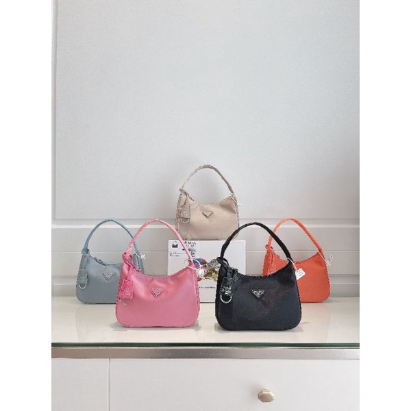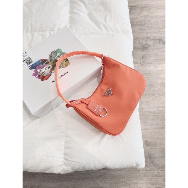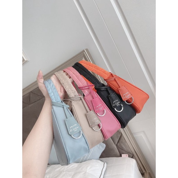 Giới thiệu Túi kẹp nách Pradaa vải dù lụa bóng hồng cam xanh nude đen