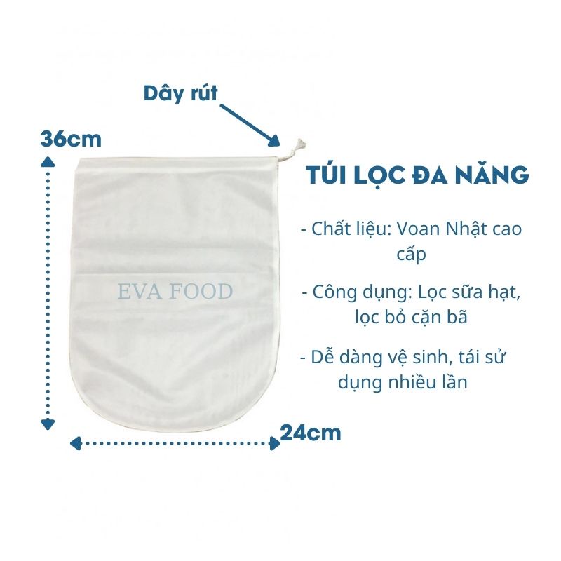 - Kích thước túi: 24 x 36cm: lọc được 1-2 lítCó 2 loại: vải dày và vải mềm, chỉ khác nhau ở chất liệu vải còn tính năng đương đương nhau