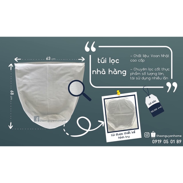 Cùng chất liệu với Túi lọc đa năng cỡ gia đình nhưng Túi lọc sữa đậu dành cho nhà hàng được thiết kế lớn hơn nhiều với kích thước rộng 63cm x dài 68 cm, túi dạng hình trụ. Chuyên dành cho các hàng làm đậu lọc đậu tương khối lượng nhiều, sử dụng cho các lồng vắt ly tâm... túi đã được cải tiến rất nhiều về chất liệu và kiểu dáng giúp các bạn có thể lọc lấy cốt bỏ bã 1 cách dễ dàng nhất, rút ngăn thời gian lọc đem lại sự tiện dụng tuyệt vời!Kích thước: 63x68cm