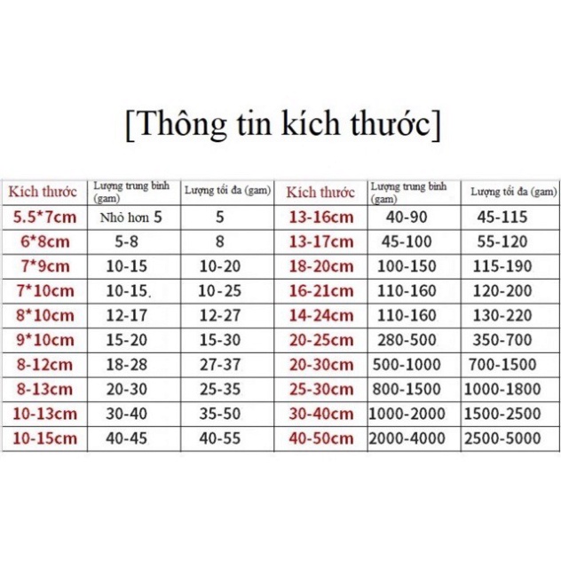 - Một túi đựng được khoảng 20g-500g nguyên liệu tùy kích thước (Có bảng hướng dẫn)
