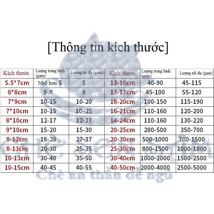 - Một túi đựng được khoảng 20g-500g nguyên liệu tùy kích thước (Có bảng hướng dẫn)