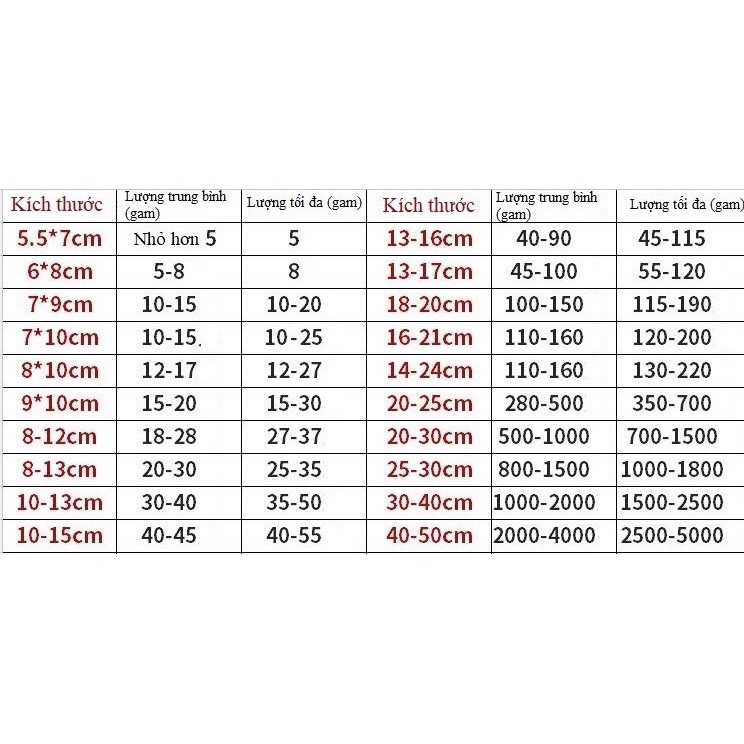 • Một túi đựng được khoảng 10g-2000g tùy kích thước