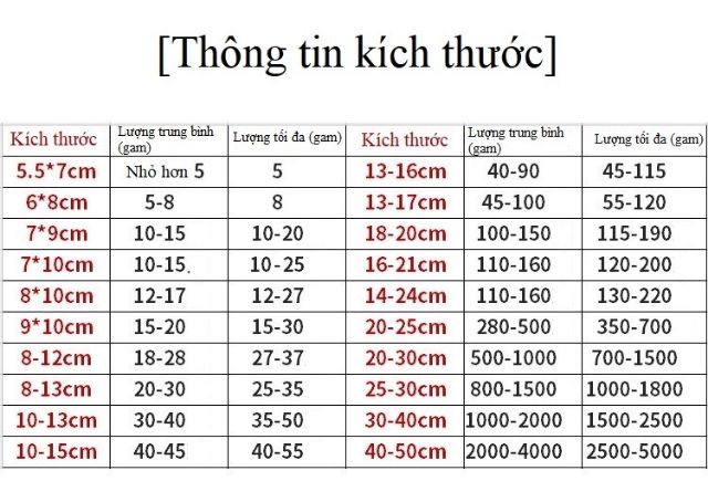 - Một túi đựng được khoảng 20g-500g nguyên liệu tùy kích thước (Có bảng hướng dẫn)