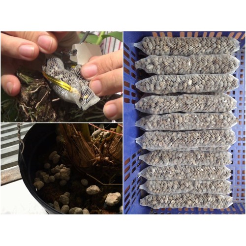 Túi lưới dùng để chứa phân tan chậm (dành cho lan công nghiệp và lan rừng) chất liệu bền đẹp, dễ sử dụng. Đặc điểm: rất tiện lợi, đơn giản, dễ làm. Cách sử dụng: tuỳ theo yêu cầu muốn làm túi chứa phân dài hay ngắn, cắt lưới ra cho phân tan chậm vào, sau đó hơ lửa, hoặc dùng ghim bấm lại hai đầu để phân không rớt ra ngoài.