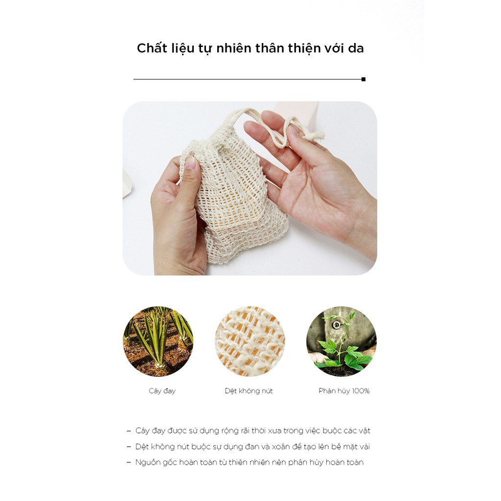 - Túi lưới rất tiết kiệm xà bông, được thiết kế với sợi Sisal tiên nhiên có thể tự phân hủy, mềm mai, không làm tổn thương da khi sử dụng