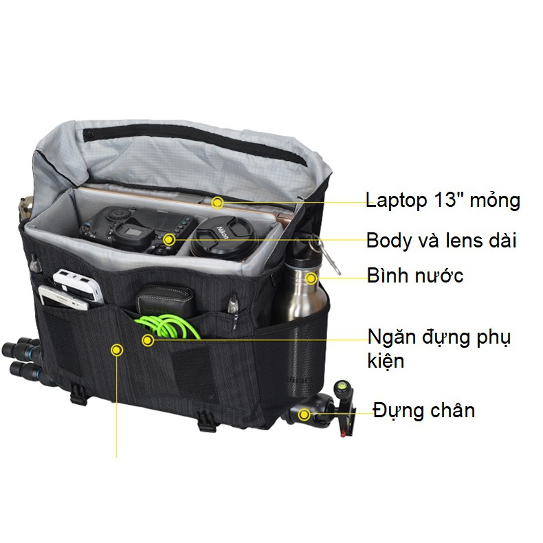 - Túi có kích thước: ngang 37cm * Cao 27cm * Sâu 18cm- Có thể để được 1 body kèm 3-4 lens, 1 Laptop 13" mỏng