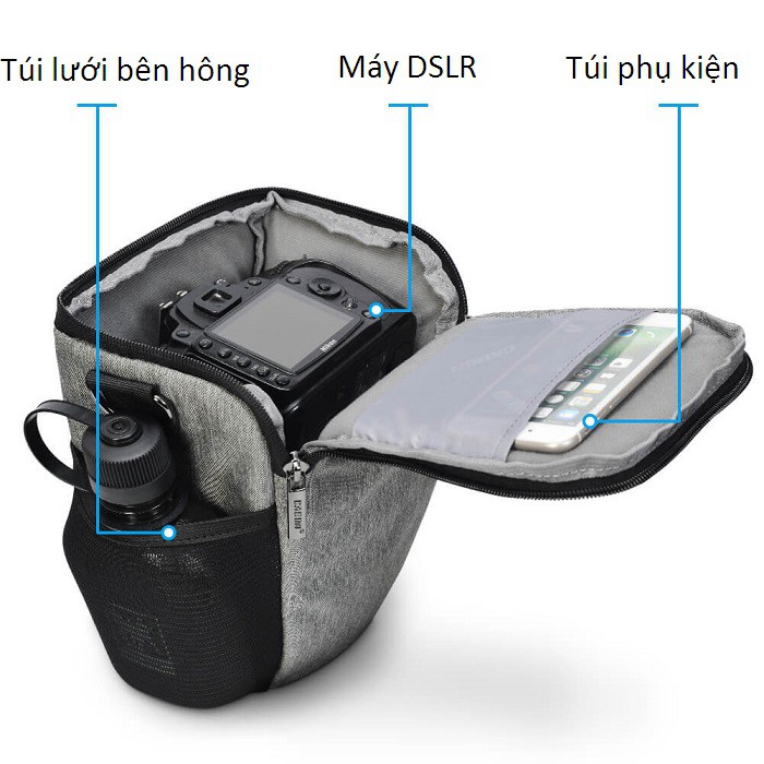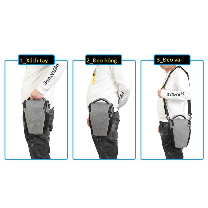 Mẫu túi thiết kế nhỏ gọn rất phù hợp cho những ngươif chụp cơ bản , với kích thước. 28* 14 * 17*cm. với sức chứa vừa vặn để chứa 1 body máy ảnh SLR cùng 1lens gắn liền._Với thiết kế, chiếc túi máy ảnh này có thể được xử dụng bằng cách đeo chéo vai, hoặc xách trực tiếp bằng quai cầm. Không những thế, mặt sau của túi có 1 đai dọc để bạn cài theo thắt lưng, đeo túi ngay bên hông để có thể lấy và cất máy cực kỳ nhanh chóng và tiện dụng.