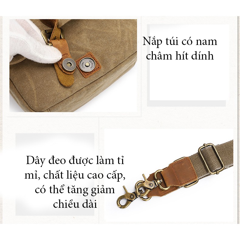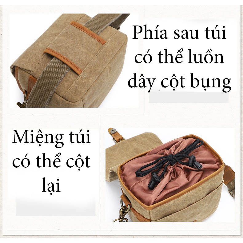 Túi sử dụng vải canvas cao cấp phối hợp với da bò tạo sự sang trọng. Vải dược làm không thấm nước rất tốt, giúp bảo vệ đồ dùng bên trong tối đa. Túi phù hợp với cả nam và nữ. Có thể sử dụng túi như 1 chiếc túi thông thường khi không để máy ảnh.
