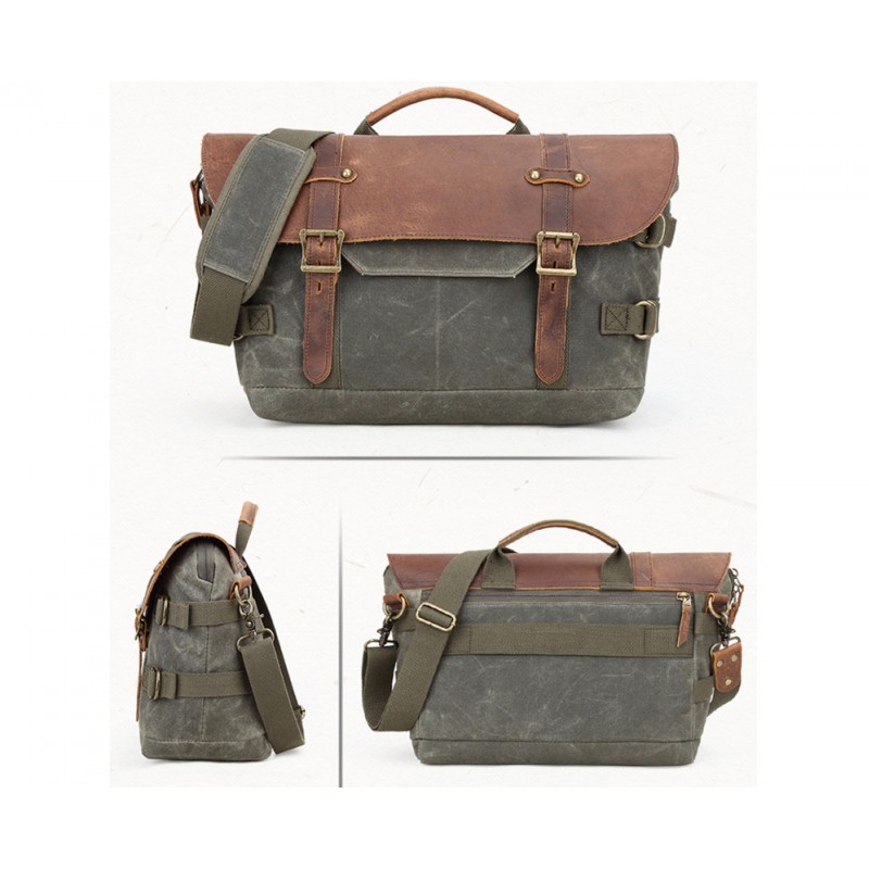 - Chất liệu: Vải Kaki kết hợp với da thật