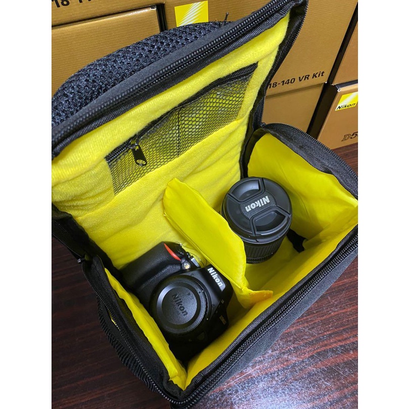 Với thiết kế trống đơn giản cùng huy hiệu NiKon nổi ở bên góc túi tạo cảm giác dễ chịu không cầu kỳ và rực rỡ. Bên trong túi gồm có ba ngăn chính và một ngăn phụ, các vách ngăn dễ dàng thay đổi từ 3 ngăn thành 2 ngăn hay thậm chí là 1 ngăn tùy theo nhu cầu sử dụng của người dùng. Ngăn phụ đủ diện tích để vừa một số phụ kiện nhỏ của máy ảnh như thẻ nhớ SD hay USB đi kèm, ngăn phụ được thiết kế ren lưới giúp chúng ta dễ dàng tìm kiếm thiết bị khi nhìn vào.
