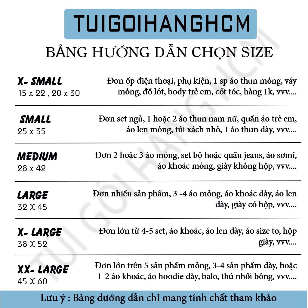 Size 25x35, 28x42 và 32x45 phù hợp nghành hàng thời trang bán lẻ, xếp 1-3 bộ sản phẩm.
