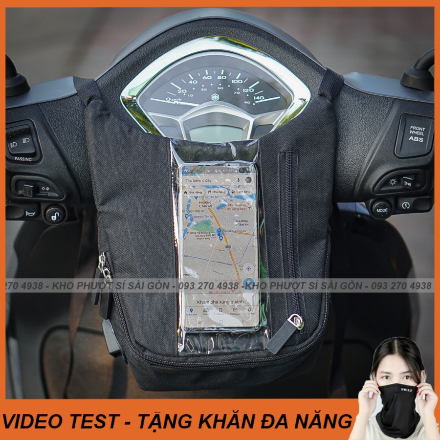 Túi treo đầu xe máy chạy Shipper Grab Goviet đựng điện thoại chiều dọc ngang kèm khăn đa năng đen