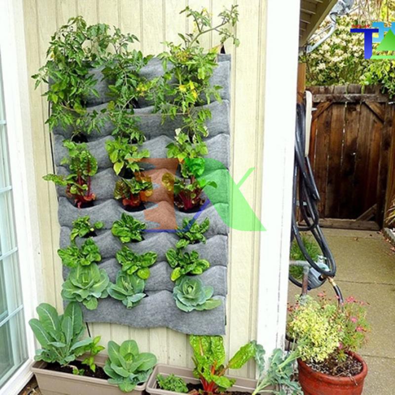 Vườn thẳng đứng dạng treo, thích hợp dùng để trồng cây, trồng hoa, trồng rau. Túi sản xuất bằng vải không dệt chuyên dụng (vải địa kĩ thuật), có khả năng chịu được nắng, mưa, ngâm nước tốt, đươc may cực kỳ chắc chắn, khuy hợp kim độ bền cực cao, dễ dàng lắp đặt ở mọi vị trí.