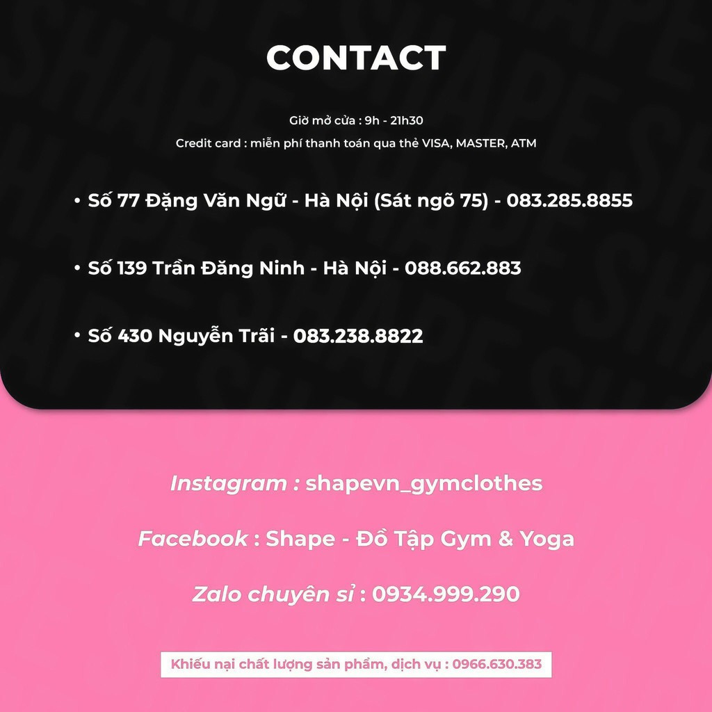 SHAPE là hệ thống cung cấp đa dạng quần áo thể thao nữ, quần áo tập gym yoga nữ, áo lót thể thao nữ, bra thể thao, đồ lót thể thao chất lượng, mẫu mã đẹp và phụ kiện thể thao như dây miniband, găng tay tập gym, bảo vệ khớp gối, băng đô, bảo vệ khớp tay, túi tập gym, túi du lịch thể thao,... uy tín, chất lượng trên toàn quốc.