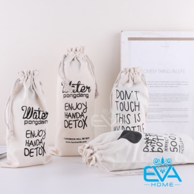 Giới thiệu Túi Vải Canvas In Chữ Dây Rút Dùng Đựng Bình Nước 500 ml - 600 ml - 1000 ml
