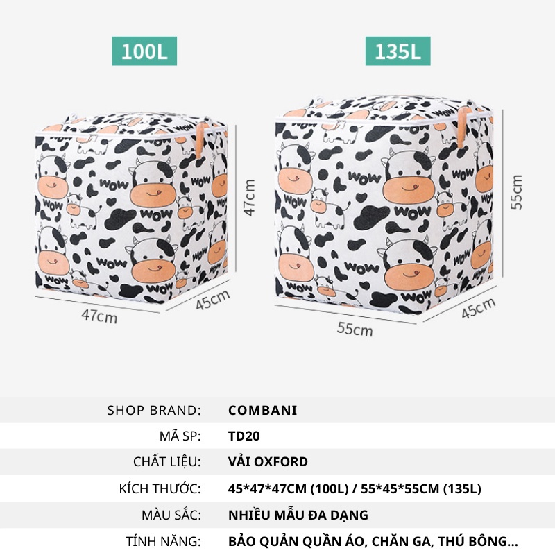 Túi Vải Đựng Quần Áo Và Chăn Có Dây Rút Dung Tích 100L Thuận Tiện Bảo Quản Cho Mọi NhàTúi Vải Đựng Quần Áo, Chăn Ga, Nắp Khóa Kéo, Cỡ Lớn, Gấp Gọn 100-135L COMBANI TD20