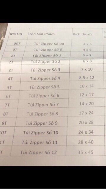 Túi số 0: 4 x 6 cm ( Khoảng 1.300 túi )