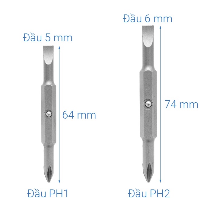 - 2 đầu bake: 1 PH1, 1 PH2.- 2 đầu Vít dẹp: 5mm, 6mm.